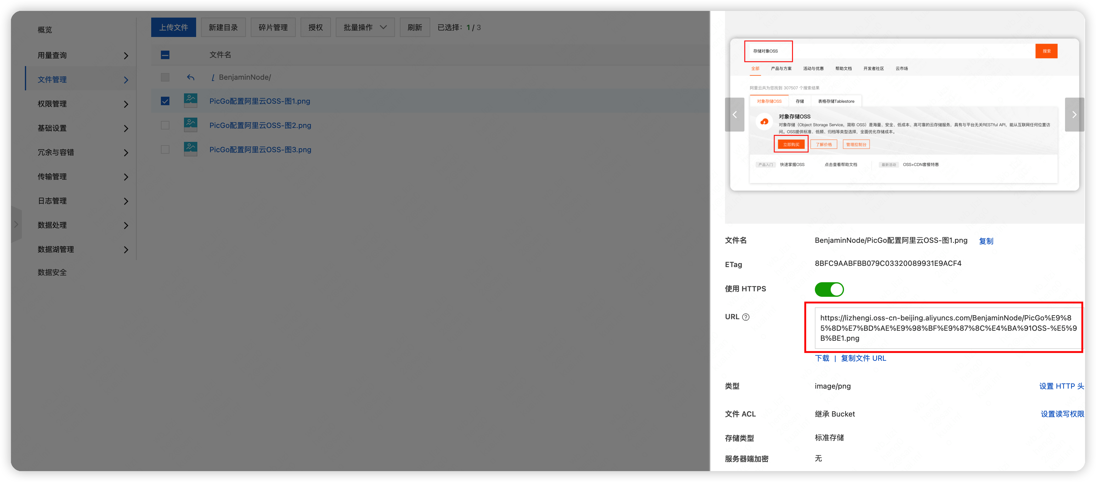 在编辑 Markdown 文档时,例如使用 Typora 编辑器,插入图片时,直接使用 OSS 上的 URL 连接,直接会关键图片文件展示,说明图片公网上是可以访问,非常的方便